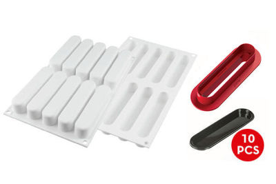 A flash of taste will brighten up your shop window. A classic pastry shape revisited in a modern key in which it's creativity, freshness and aesthetic blend together to create Fashion Eclair by Silikomart Professional. A mould with 10 cavities by 80 ml each to create refined semifreddos with different colour combinations. In each package, ten little plates for a perfect final presentation and a plastic cutter is included to make original inserts and/or bases which perfectly match with the shape of the mould.