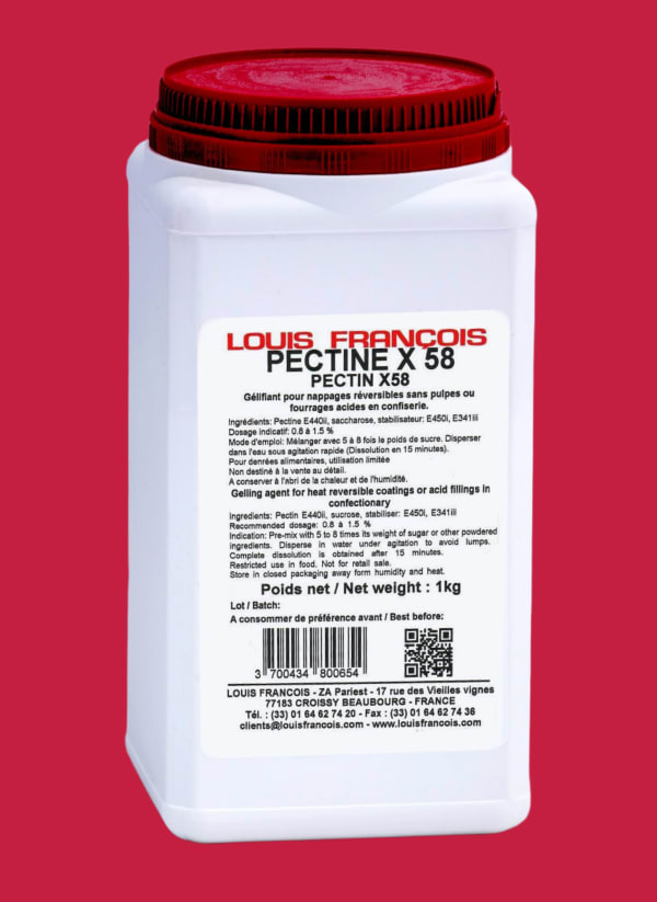 Louis Francois pectine X58 is a thickener and gelling agent especially useful in creating jellified glazes for pâtisserie. Pectine X58 is an odourless powder which can be used in water, fruit juices and purées. Once solidified, fruit glazes can be gently melted and brushed over fruit tarts to seal in moisture and improve shelf life.
