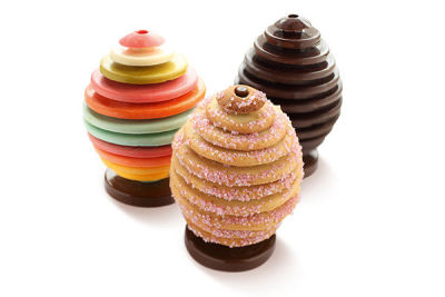 The 3D Egg Choc mould allows you to create two three-dimensional eggs made of chocolates or biscuits. In addition to the mould, the package also contains two polypropylene bases and a recipe book.
